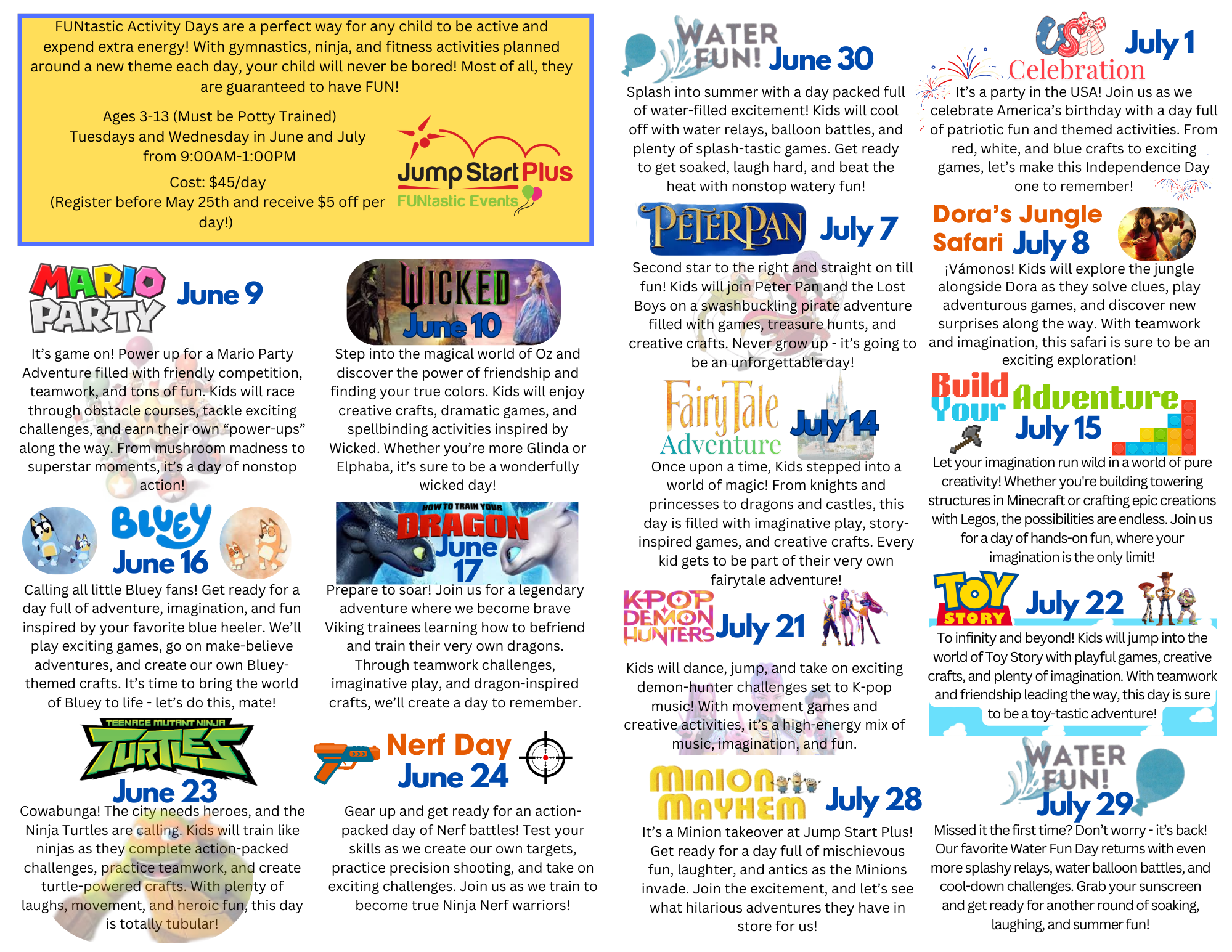Our activity days are planned throughout the year when school is out! On these select days, your child can join us for a themed day full of fun, activities, and movement!